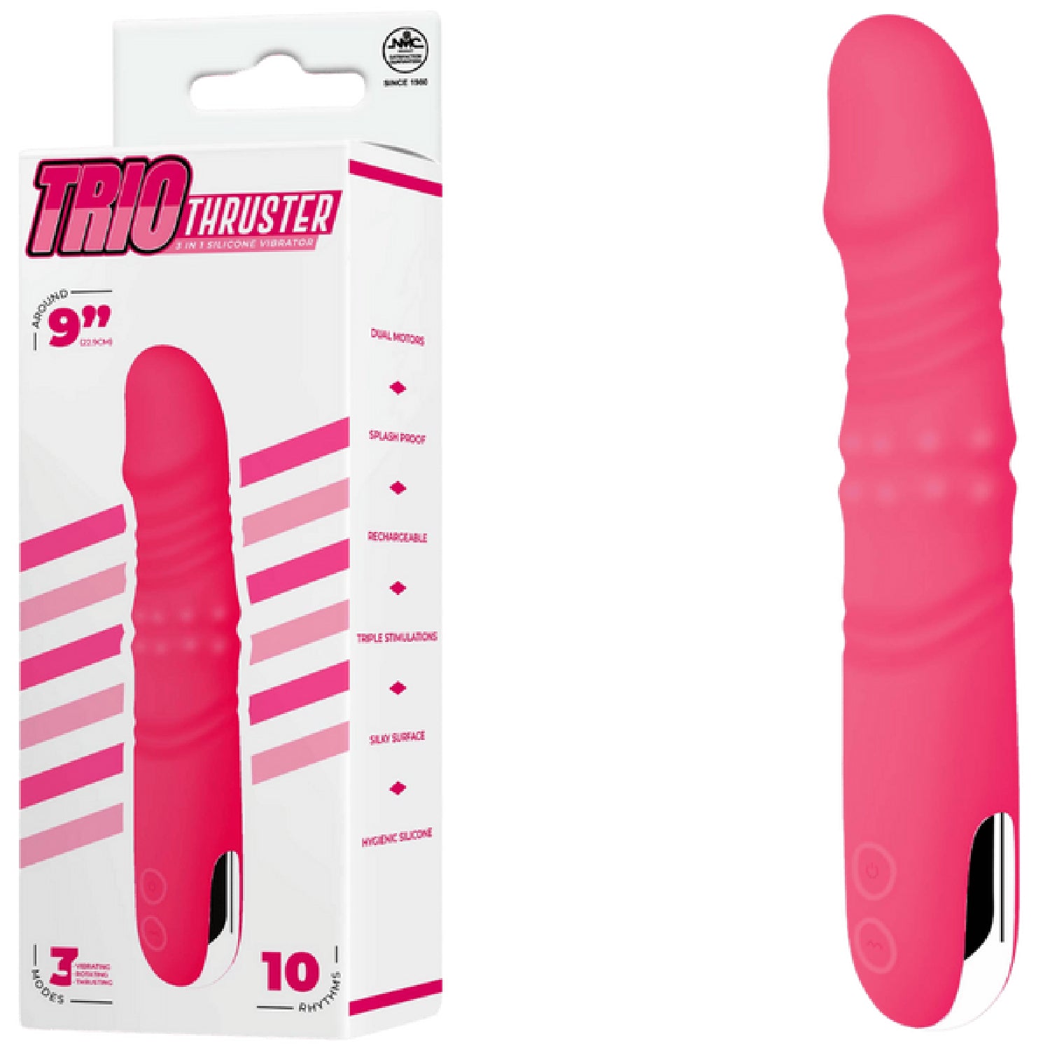 Experience unparalleled pleasure with the Trio Thruster 3-in-1 Silicone Vibrator, designed to ignite your senses with its daring triple-action stimulation.