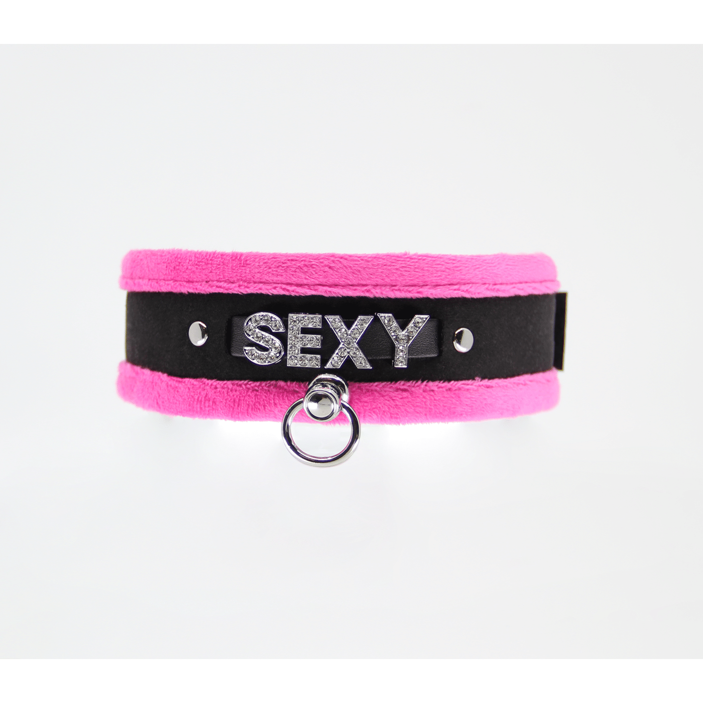 Indulge in this soft, plush collar adorned with ‘SEXY’ spelled out in sparkling diamante. Designed for comfort and flair, it fastens securely with Velcro and features a centre ring on a rotating toggle for unrestricted movement. Adjustable between 32cm and 54cm, this 4cm-wide collar measures 56.5cm in total length. Available in black, red, pink, and daring purple, it pairs perfectly with matching wrist cuffs and a blindfold to complete your bold look.