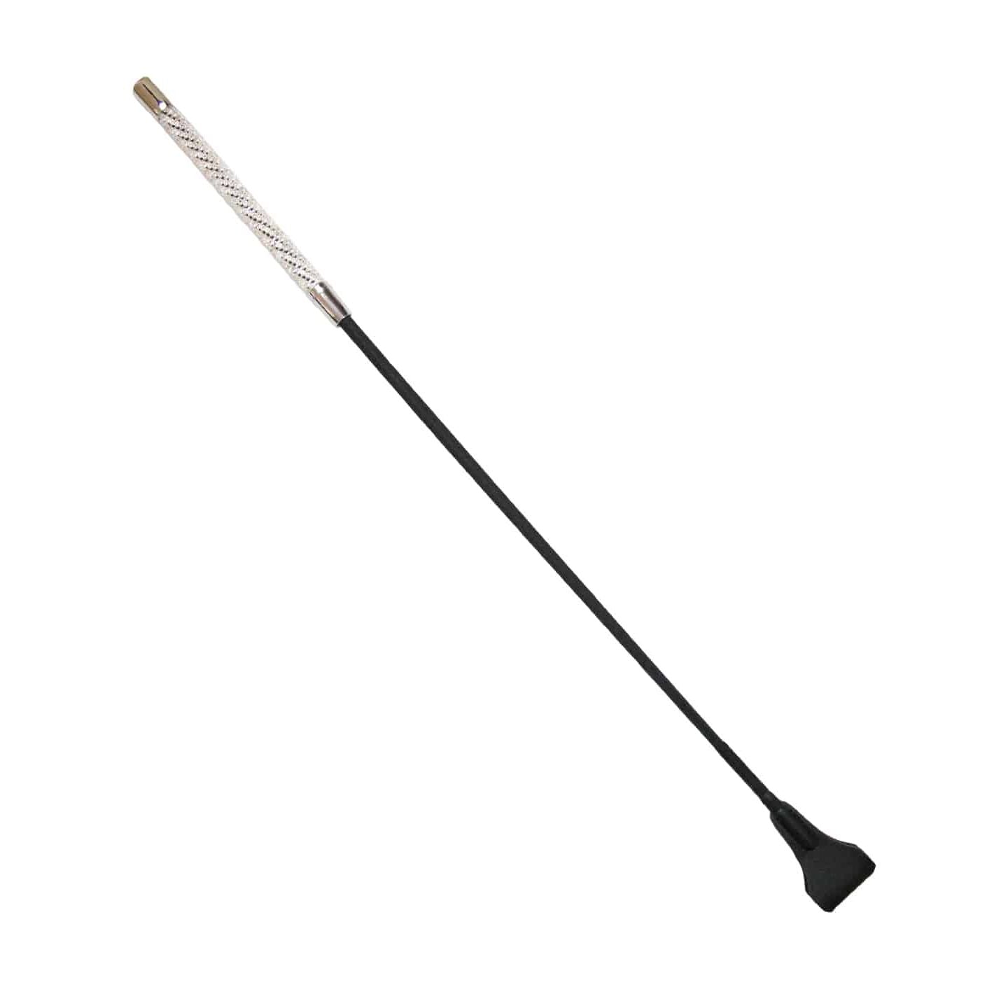 Add a touch of sparkle to your style with this long crop featuring a dazzling diamanté-encrusted handle capped with sleek silver accents. Measuring 66cm from end to end, its flexible braided nylon rod offers comfort and control, while the wide leather tab adds a bold, stylish flair. Complete with a black nylon wrist strap and branded Love in Leather details, this crop is as playful as it is chic—perfect for those who like a little shine with their sway.