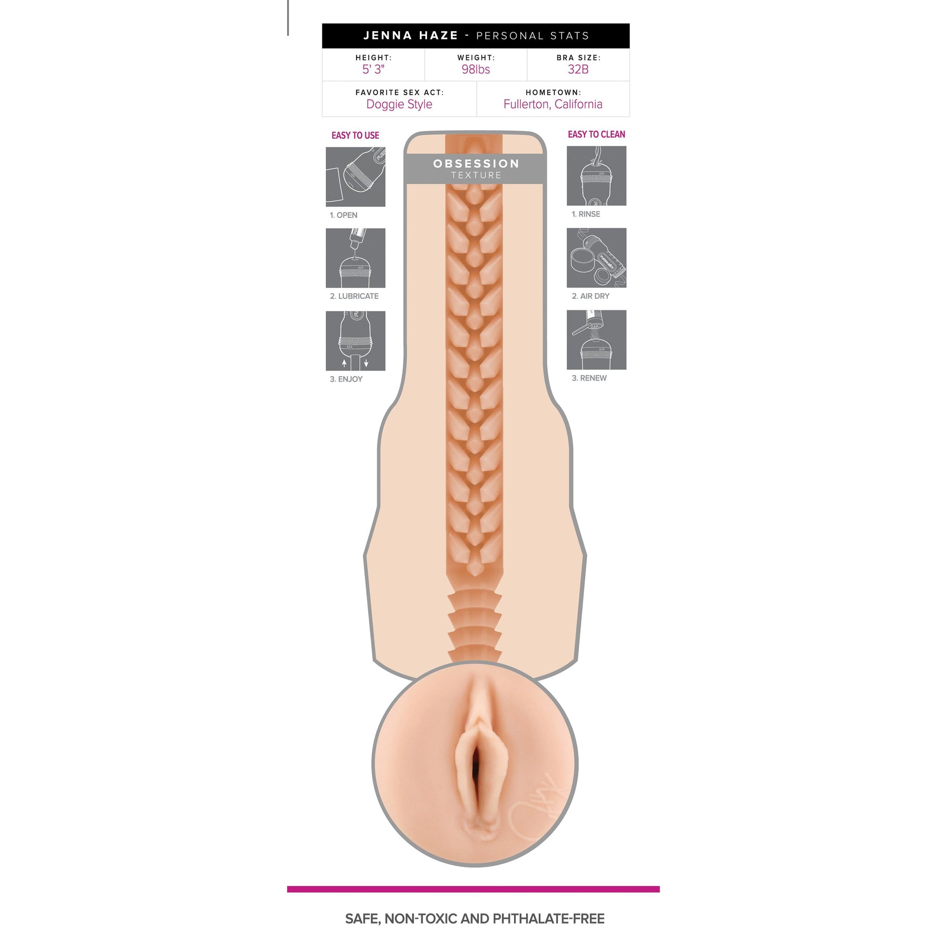 Imagine being inside an exact molded reproduction of this beautiful brunette's pussy. Slide your member into the Obsession inner texture. What is it? It is just like Jenna's pussy. You will slide in, and then as you go deeper, the packed bristles will tighten around you as you thrust in and out.