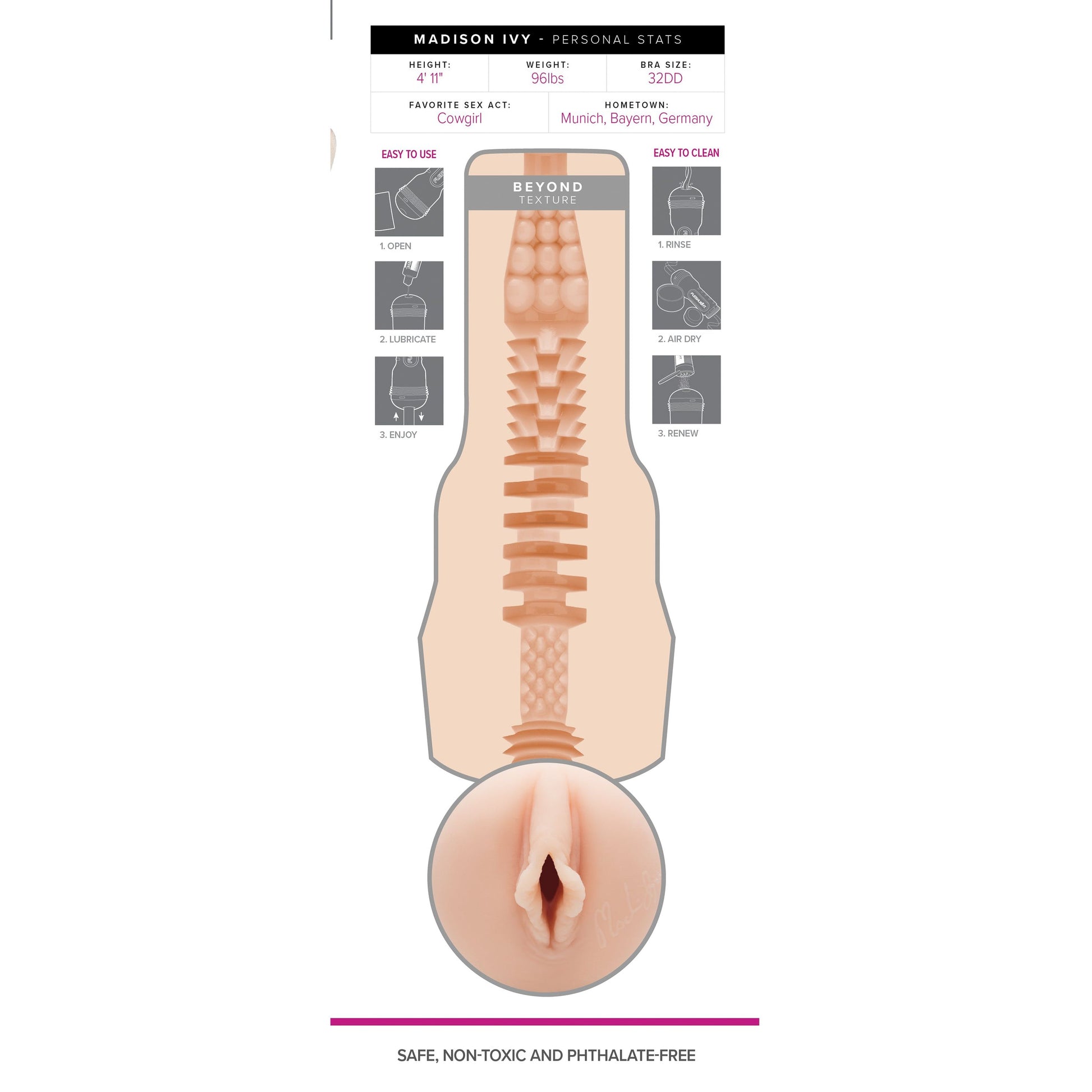 Madison Ivy, a passionate nymphomaniac and petite porn icon, is famous for her fiery performances and tight, alluring curves. This Fleshlight captures every inch of her intense pleasure, letting you experience the thrill of her taut vagina and sizzling anal orifice. Feel the lifelike texture with ribs and nubs that mimic her intimate folds, designed for ultimate ecstasy. With discreet shipping and options for added lube and other star collections, you can unleash your wildest fantasies and indulge in Madison’s irresistible allure whenever you want.