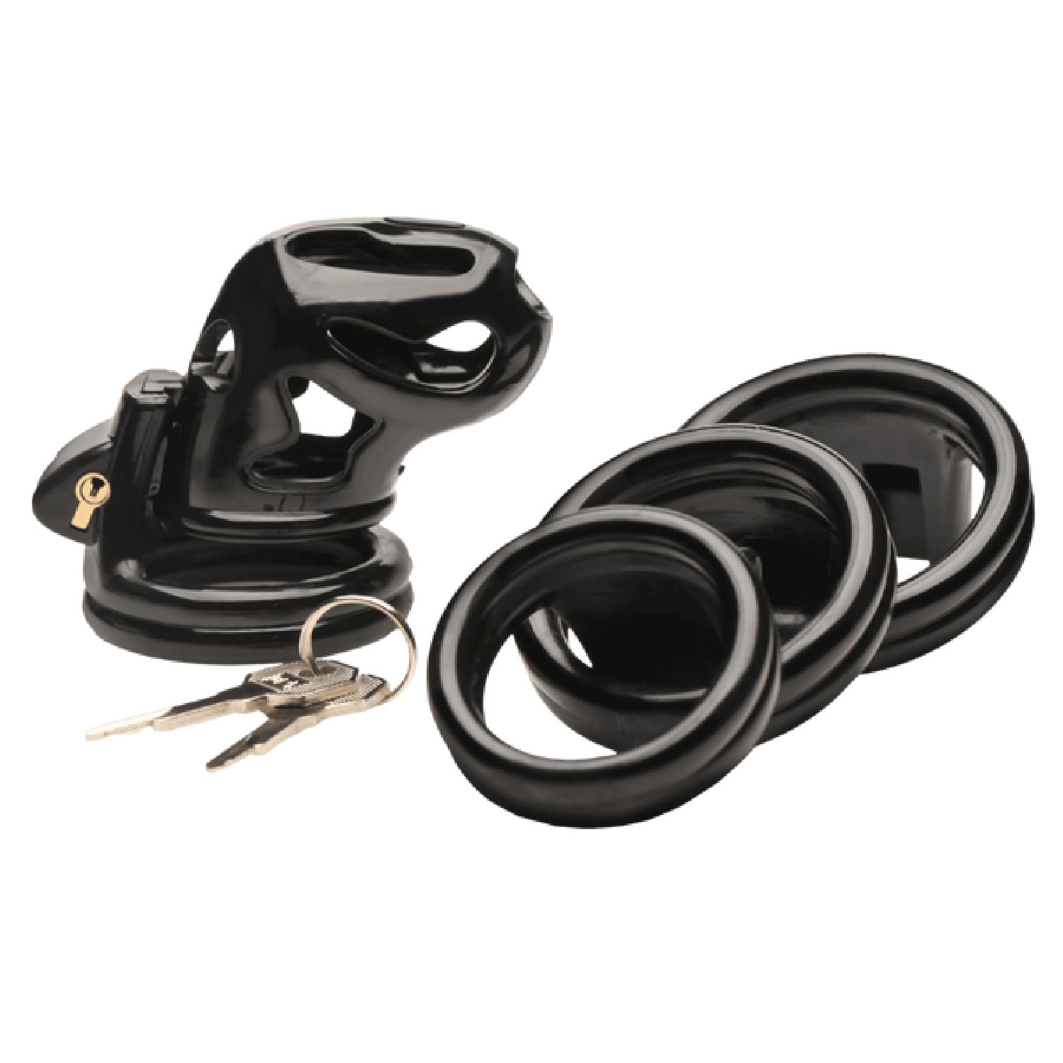 Step into the realm of pleasurable restraint with the Hard Stop Double Ring Chastity Cage. Made from sturdy black plastic, this starter cage is ideal for newcomers. It boasts an intuitive locking mechanism with two keys for peace of mind. With four adjustable rings, finding your ideal size is easy. The design includes several vents for maximum airflow and comfort during extended wear, along with a hole at the tip for effortless urination. Experience long-term confinement with a balance of security and ease.