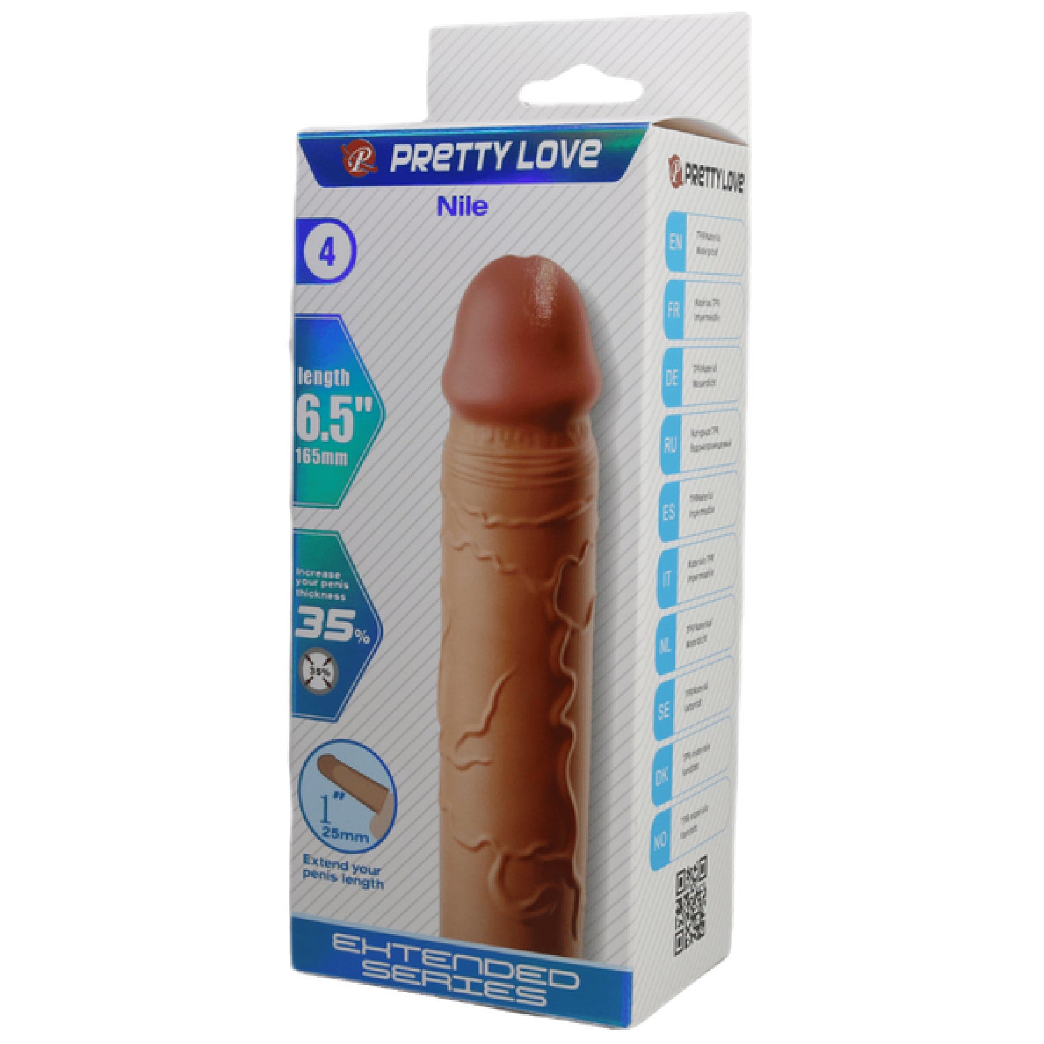Enhance length and girth with the Pretty Love Nile, a TPR penis extension sleeve designed to add 1" of length and 35% extra thickness for maximum pleasure. The realistic, soft material and lifelike detailing provide a natural feel for both partners, while the smooth internal canal ensures comfortable wear and easy insertion.